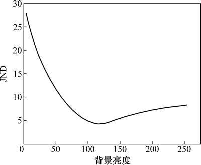 在背景光强度为I的均匀光照区域,若存在1个亮度为I+ΔI的光斑,则这个光斑能被人眼察觉的条件是ΔI大于某个值,这个刚好能被人眼分辨的亮度差叫做刚可分辨亮度差(just noticeable difference, JND),ΔI和I的比叫做阈值亮度比(threshold versus intensity, TVI)。在低背景亮度和高背景亮度之间的相当宽的背景亮度范围内满足韦伯定律,ΔIc/I称为韦伯比,其中ΔIc为在背景亮度为I的条件下可辨别亮度增量的50%。ΔIc/I较小表示可辨别强度较小的百分比变化,意味着亮度辨别能力较好,ΔIc/I较大则反之。lg(ΔIc/I)作为I的对数函数,其通常形状如图2所示。由图2可以看出:在低照度情况下,韦伯比较大,亮度辨别力差,随着照度增加,韦伯比下降,亮度分辨力得到改善。因此,模拟人眼主观视觉有区别地处理不同亮度背景下的细节,能解决强边缘处过增强和平坦区欠增强的问题。