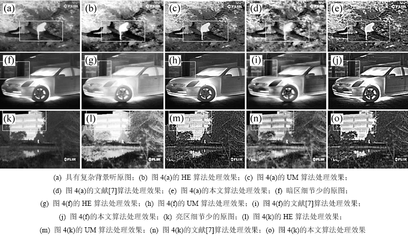 。比较表1中各算法处理结果的熵,HE算法处理易使细微部分的细节丢失,其熵明显降低;文献[7]的熵有所增加,原因是平坦区的细节显著增强,甚至在边缘附近出现晕轮现象;UM算法容易在边缘处出现过增强的现象,因此熵比本文算法的熵小。如图4所示的矩形方框内,传统的HE算法的复杂背景区域成了大片的高亮度区域,暗区和亮区的细节完全被掩盖;UM算法整体对比度较差,在复杂背景区域和暗区的细节增强不明显,且在亮区出现了不希望的斑点;文献[7]算法整体对比度较好,但在暗区会出现“意外”的细节使细节模糊化,在复杂背景区域分不清目标和背景。