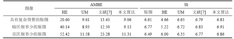 (Xm为输入图像的亮度,Ym为输出图像的亮度)。对上述4组图像的测试结果如表1所示为AMBE的计算结果。从表1可以看出:UM算法和本文算法都能较准确地保持输入图像的亮度,HE算法的保持效果最差,尤其是其中存在大量暗区或亮区的图像,而本文算法亮度保持效果较好的原因是对其基本层进行基于GMM的直方图规定化。