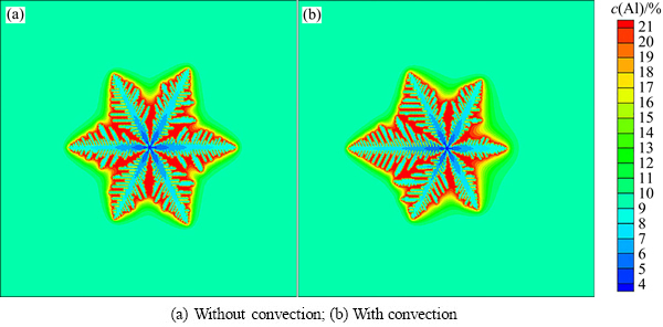 方向生长,枝晶各个分支呈60°夹角,且每个分支大小一致。当有对流作用时,枝晶呈现非对称生长。在迎流端,枝晶分支发达,二次枝晶臂亦较为发达;在背流端,枝晶分支生长相对细小,二次枝晶臂也较迎流端细小。模拟结果与使用PF模型[7, 10]模拟结果一致,但相较于PF模型,CA方法计算速度更快,计算域更大。