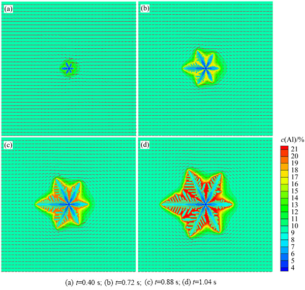 Fig. 1 Simulated results of equiaxed dendritic morphologies of AZ91 magnesium alloy (inlet velocity of 0.1 mm/s)