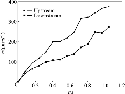 图2所示为当冷却速率为80 K/s、入流速度为0.1 mm/s时AZ91镁合金单个等轴枝晶的生长演变过程。由图2可知,随着凝固的进行,AZ91镁合金固相率不断增加,已凝固的固相将溶质排出到液相,并逐渐扩散到周围的液相中。在迎流端,枝晶受到流体的冲刷,溶质扩散层较窄,浓度梯度高,使枝晶尖端出现局部过冷度增大的现象;而在背流端,流体流经时,流速较小,对枝晶的冲刷也较弱,溶质扩散层较宽,浓度梯度较低,从固相排出到液相的溶质来不及扩散,溶质富集而阻碍枝晶的生长[17]。图3所示为迎流端和背流端枝晶生长速率随时间的变化。由图3可知,迎流端尖端生长速率大于背流端。因此,迎流端生长较快,枝晶呈现非对称生长。