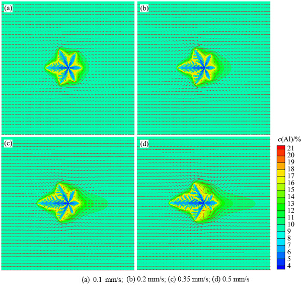 图4 不同入流速度下AZ91镁合金等轴枝晶生长模拟结果