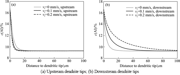为进一步分析入流速度对镁合金枝晶生长的影响,图5所示为不同入流速率下,枝晶迎流端(见图5(a))和背流端(见图5(b))前沿溶质元素含量距离枝晶尖端的分布情况。从图5中可以看出,与上述分析的变化趋势相对应,迎流端溶质梯度大,而背流端溶质梯度小。入流速度越大,迎流端溶质梯度越大,因此枝晶生长越快;而在背流端,入流速度越大,溶质梯度越小,从而枝晶生长越缓慢(见图4(d))。