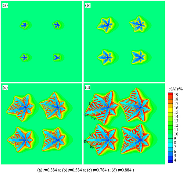 在实际铸造条件下,凝固组织通常由不同取向的多个晶粒组成。图6所示为对流作用下具有不同取向的AZ91镁合金晶粒的演变过程。计算区域被划分成500 × 500个单元,网格步长为2 μm,将4个不同取向的核心种入区域,冷却速度为80 K/s,入流速度为0.2 mm/s。由图6(a)可以看出,在初始凝固阶段,各个枝晶独立生长,相互之间没有阻碍,在每个枝晶的周围可看到受对流作用影响而形成的不对称扩散层,扩散层在迎流端较窄,在背流端较宽,且随枝晶取向的变化而不同。随着凝固过程的进行(图6(b)~(d)),由于受流体冲刷影响,枝晶前端比后端生长粗大,且开始出现二次枝晶臂。模拟结果与文献[10]中模拟结果一致,与文献[28]中砂型AZ91D显微组织实验结果也十分相似。值得一提的是,对于不同取向的枝晶,受流体冲刷时,出现了不同的枝晶生长形态。图6所示的4个等轴枝晶的晶体取向分别为0°(左下)、15°(左上)、30°(右下)和45°(右上)。在迎流端最前沿的分支始终生长最粗大。对比左侧0°和15°取向枝晶,0°枝晶的最前沿分支(g0)呈现对称生长,g0的上部二次枝晶臂为t0;而15°枝晶的最前沿分支(g15)呈现非对称生长,g15的上部二次枝晶臂t15生长发达,枝晶臂较长,而下部二次晶臂b15生长较弱。对比二次晶臂t0和t15,发现t15比t0生长发达。主要原因是当枝晶分支生长方向与流体流向平行时(此时只代表迎流端的情况),主干迎流端受到流体冲刷作用最大,当枝晶分支方向与流体流向呈一定角度时,流体冲刷作用相对削弱,上述所说的t0与流体流向夹角大于t15与流体流向夹角,因此,t0生长弱于t15。