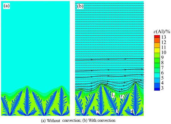 图7所示为模拟得到的无对流和有对流作用时AM60镁合金柱状枝晶的生长形态。计算区域为300×500个单元,网格步长2 μm,定向凝固温度梯度为10 K/mm,方向沿垂直方向,初始时刻在计算区域底部放入4个形核核心,计算开始后,令计算区域以2.5 K/s的冷却速率进行冷却。为便于说明,在此将柱状晶从左到右依次编号为1、2、3、4号柱状晶。比较图7(a)和(b)可以发现,对流会对柱状枝晶的生长产生影响。由于左侧柱状晶的阻碍,只有受到溶质冲刷区域的枝晶生长比无对流时稍显粗大。对于3号柱状晶,左侧60°分支(l3)由于受到流体的冲刷比无对流时生长较长,且二次枝晶臂也相对较大。对比3号的右侧分支(r3)和4号的主分支,可以发现,由于r3生长相对减弱,使4号枝晶主干左侧二次枝晶臂具有足够的溶质扩散空间,进而促使4号枝晶主干左侧二次枝晶臂的生长。