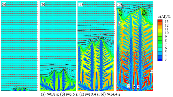 图8所示为模拟得到的3个取向一致的柱状晶在对流作用下的演变过程。计算区域为200 × 500个单元,网格尺寸4 μm,其它条件与前述条件一致,并将3个柱状晶依次编号为5、6、7号柱状枝晶。虽然计算区域只有3个柱状晶,但3个晶粒之间间距较小,为了达到稳态,各个晶粒间要不断的协调竞争生长。由图8可以看出,6号晶粒在柱状晶的竞争生长中不断落后,最终5号和7号晶粒生长成粗大的柱状晶。同时,5号柱状晶二次枝晶臂l5在流体的冲刷下,不断长大,并在与周围二次枝晶臂的竞争生长中突显,最终长成和5、7号主干一样尺度的分支。此外,还可发现7号主干右侧二次晶臂比左侧发达,原因是由于左侧受到5号主干的竞争作用,生长受到阻碍,而右侧由于二次晶臂r7并未长成主干,溶质有较广阔的扩散空间,二次枝晶臂的生长不受枝晶的限制,所以生长较多也稍显粗大。相对于等轴枝晶受流体冲刷的结果,柱状枝晶的影响相对较小。从以上柱状晶受流体作用后的枝晶演变过程可以看出,虽然在等轴枝晶形貌上不同,但对于受到流体冲刷的枝晶臂,生长都较为粗大;不同的是,在柱状晶生长过程中,受靠近迎流端主干的阻碍和遮挡,流体冲刷给柱状枝晶的生长带来的影响会削弱,这与YUAN等[16]的结果一致。