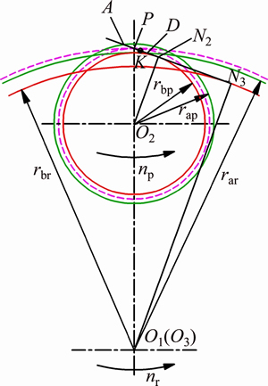 The geometric model of the internal meshing gears in the planetary gear train is shown in Figure 2. N2 and N3 represent the theoretical engage-in point and recess point, respectively. Actually, A is the true engage-in point and D is the true recess point. rbp and rbr denote the radii of the base circles (p represents the planetary gear and r denotes the internal gear here and below) and their rotation speeds are np and nr, respectively. P is the pitch point, and K denotes any possible meshing point during the transmission process.