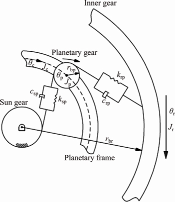 where Jr represents the moment of inertia of the inner gear, θr is the torsional angular displacement induced by the vibration, krp and crp are the meshing stiffness and damping between the planetary gear and the inner gear, respectively, △rp is the displacement of the planetary gear and the inner gear at point K along the line of action (LOA), and Tp is the input torque.