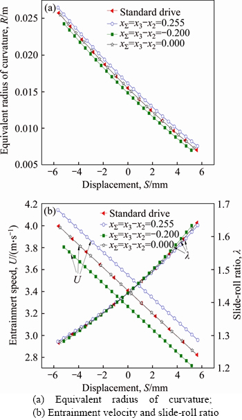 Figure 7 shows the variations of the comprehensive radius of curvature, entrainment velocity, and slide-roll ratio. The modification coefficient had significant influence on the tooth profile. Among the different transmission types, both the comprehensive radius of curvature and the entrainment velocity were the largest when the positive drive was used. For the negative drive, the comprehensive radius of curvature was the smallest, leading to the smallest entrainment velocity. The inner gear was active. As shown in Figure 2, A was the engage-in point. Based on the properties of the involute curve, the comprehensive radius of curvature decreased consistently in the transmission process. Affected by the comprehensive radius of curvature, the entrainment velocity continued to decrease.