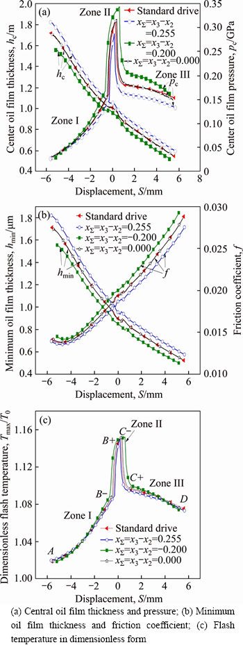 Figure 8 shows the performance of the gear system. Figures 8(a)-(c) show the variation of the central oil film thickness and pressure (hc and pc), minimum oil film thickness, and friction coefficient (hmin and f) as well as the flash temperature of the oil film in dimensionless form (Tmax/T0).