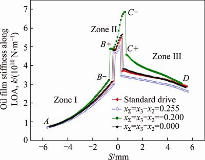 Figure 9 depicts the distribution of the oil film stiffness along the line of action (LOA). When the load was unchanged, in the analysis of the lubricating performance within different transmission types, the oil film thickness of the positive drive was the largest. A thicker oil film corresponded to an increase in the distance between the lubricant molecules as well as a decrease in the intermolecular repulsion. The smaller intermolecular repulsion between the lubricant molecules was, the more easily the oil film was compressed, which meant that the oil film stiffness was smaller. Consequently, the oil film stiffness of the positive drive was the smallest. On the contrary, the oil film stiffness of the negative drive was the largest. Regardless of the type of transmission, at the last point (C-) of Zone II, the oil film stiffness reached its peak.