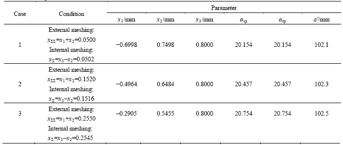 where z3 and z2 denote the tooth number of the inner gear and the planetary gear, respectively, and the modification coefficients are denoted as x3 and x2, respectively.