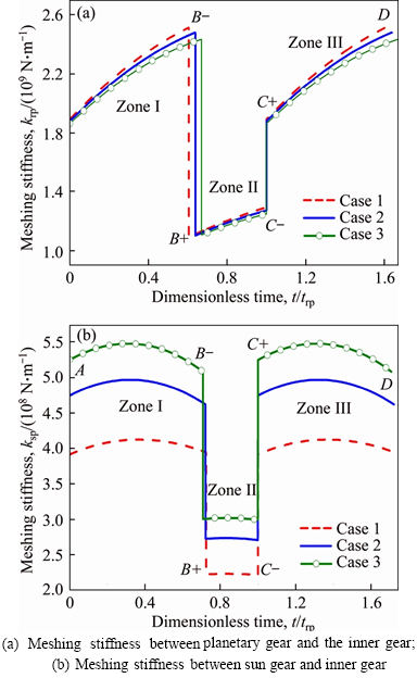 . For both the external meshing and internal meshing, at the alternation points (B and C) of the different zones, the meshing stiffness changed dramatically, leading to tooth-change impact.