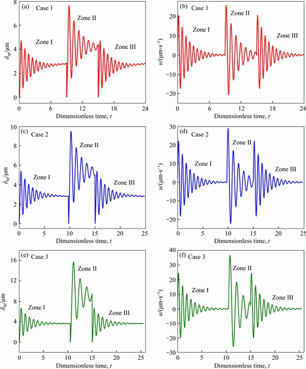 Aviation transmission gears are characterized by high carrying capacities, harsh operating conditions, and high reliability requirements. For nonlinear gear systems, especially high-speed and heavy-duty gear systems, the influence of dynamic loads induced by vibrations on the lubrication characteristics cannot be ignored. Studies of gear transient elasto-hydrodynamic lubrication (EHL) have been mostly conducted using simplified static load models [1-6]. Some scholars have also considered the effects of dynamic loads induced by vibrations or impacts on the lubrication performance. WANG et al [7, 8] considered the effect of the damping ratio and velocity, and obtained numerical solutions for dynamic loads that accounted for the distribution of oil film thickness and friction coefficient. WANG et al [9] studied the effect of the impact load on lubrication and discovered that the oscillations of the oil film pressure and thickness often fall behind those of the loads. De la CRUZ et al [10] established a tribo- dynamics model for spur gears and performed a considerable amount of useful work on the subject of transient thermal mixed lubrication. The results showed that the oscillations of the oil film pressure and thickness aggravated the vibrations of the gear system and contributed to the production of noise. XUE et al [11] analyzed the lubrication characteristics under dynamic load using numerical simulations. LI et al [12, 13] and KANG [14] investigated the fatigue characteristics of gears based on one tribo-dynamics model. BARBIERI et al [15] established a coupled model for gear lubrication and vibration, and the results showed that lubrication performances such as oil film thickness and pressure are influenced by the dynamic characteristics. Although the above studies accounted for the effects of dynamic loads, they ignored the influence of the velocity fluctuations on the teeth surfaces caused by impact loads or vibrations. In addition, some scholars [16-18] studied oil film stiffness based on a static load model but failed to relate them to the vibrations. ZOU et al [19] carried out coupling research on EHL and vibration. However, the description of the dynamic properties exhibited by the oil film under the dynamic load model was insufficient. YUAN et al [20-22] studied the lubrication performance based on one mixed lubrication model considering the coupling effect of the lubrication and vibrations. The results had great significance on subsequent studies.
