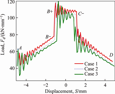 the steady value of dynamic load decreased slightly. However, near the engage-in point (A) and the alternation points (B and C), the vibration amplitude of the dynamic load increased. In addition, the vibration frequency was weakened, which means that the engage-in and tooth-change impacts were intensified. This was mainly caused by a decreasing meshing stiffness (krp) between the planetary gear and the inner gear.