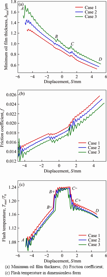 the minimum oil film thickness increased while the friction coefficient (f) and the flash temperature of the oil film (Tmax/T0) in dimensionless form decreased consistently, which indicated that the lubrication performance was further improved. From the perspective of the mechanism, this is consistent with the result in Figure 7, which was mainly caused by the increasing comprehensive radius of curvature and entrainment velocity.