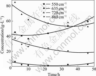 孙素琴等[69]用近红外傅立叶变化拉曼光谱仪原位跟踪了铝酸钠溶液碳酸化过程,发现代表离子的625 cm-1处的拉曼光谱峰在通入CO2分解过程中会逐步减弱;刘吉波[70]、尹建国等[71]分别研究了超声波处理铝酸钠溶液和加入阳离子聚丙烯酰胺强化种分过程,观察到这两种处理方法均使铝酸钠溶液中