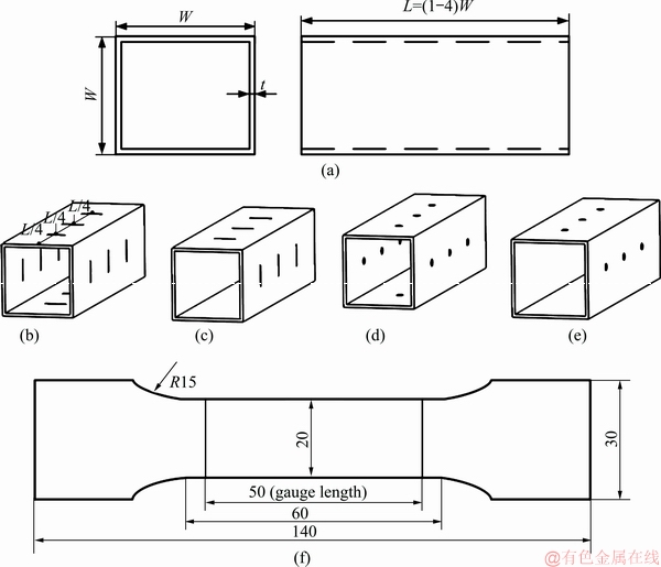 A series of axial crush tests were performed on pristine square tubes of AZ31B magnesium and A6063 aluminum with lengths of (1-4)W as well as on those with induced features. The cross-section dimensions of the magnesium and aluminum tubes were 50 mm × 50 mm × 2 mm and 40 mm × 40 mm × 2 mm, respectively (Fig. 1(a)). In addition to the pristine tubes, tubes with induced features such as symmetrically or asymmetrically distributed cracks or holes were also tested (Figs. 1(b-e)). In the case of the magnesium tubes, the cracks were 20 mm × 1 mm and the hole diameter was 5 mm. For the aluminum tubes, the cracks were 16 mm × 1 mm, and the hole diameter was 5 mm. The locations and distributions of the cracks and holes are shown in Fig. 1(b). In addition, Fig. 1(f) shows the shape of specimens used for obtaining the mechanical properties of AZ31B magnesium and A6063 aluminum alloys, in which the specimens were cut from the walls of the square tubes along the axial direction.