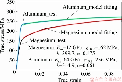 The elastic-plastic mechanical properties of magnesium and aluminum alloys are shown in Fig. 2. The elastic modulus (Em) is the slope of the elastic stage of the stress-strain curve. The initial yield stress was determined based on the 0.2% offset criterion (σyp=σ0.2). To reflect the hardening characteristics, the power-law material model [31] given in Eq. (1) was used to fit the plastic strain (σp) and stress (σy) data to obtain the hardening exponents (n) and strength coefficients (k) and the results are incorporated in Fig. 2.