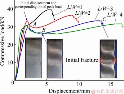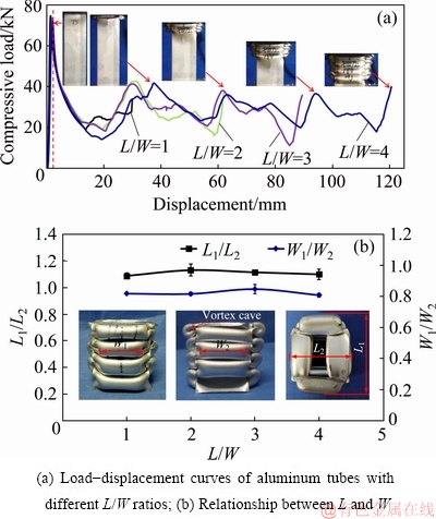 Fig. 3 Buckling process and load-displacement histories of magnesium tubes with different L/W ratios