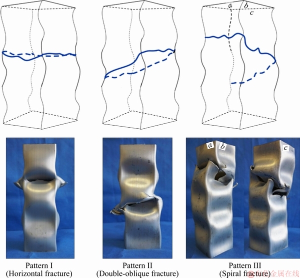 Fig. 4 Three fracture patterns of magnesium square tubes (L/W=4) under compression