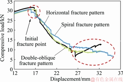 Fig. 5 Load-displacement curves showing stages of three fractures patterns of magnesium tubes