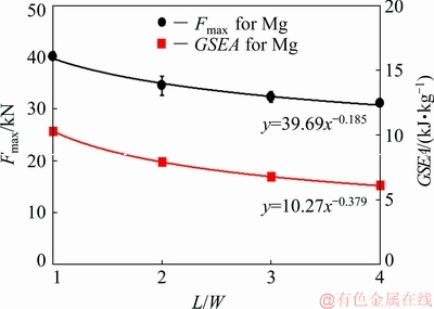 Fig. 7 Variations in Fmax and GSEA with L/W for magnesium tubes