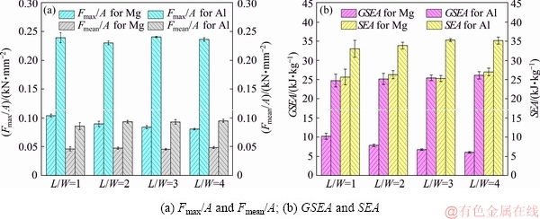 The comparison of the load-carrying and energy- absorption abilities of the magnesium and aluminum tubes are shown in Fig. 8. To ensure consistency, Fmax and Fmean were divided by the cross-sectional areas of the tubes, denoted as Fmax/A and Fmean/A, respectively. It is clearly seen that the load-carrying ability (represented by Fmax/A and Fmean/A) and energy-absorption level (represented by GSEA and SEA) of magnesium tubes were lower than aluminum tubes, irrespective of the L/W ratio.