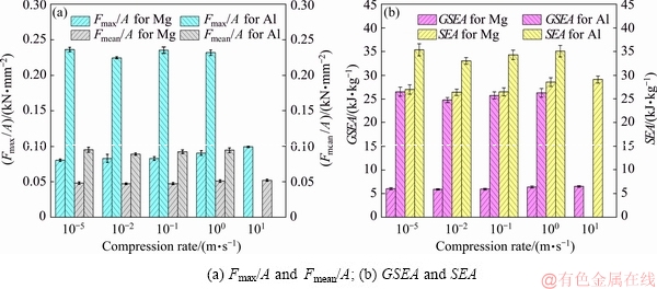 The crush modes of the magnesium and aluminum tubes with L/W=4 under dynamic compression are similar with those observed in quasi-static tests. The Fmax, Fmean, SEA and GSEA values under the dynamic conditions were normalized to dynamic strength ratios, as Fmax(d)/Fmax(s), Fmean(d)/Fmean(s), GSEA(d)/GSEA(s) and SEA(d)/SEA(s), respectively, through dividing by the corresponding values under quasi-static condition. Considering the fact that the dynamic strength ratios of Fmax, Fmean, GSEA and SEA are approximately the same for a constant L/W ratio, therefore, only the variation of dynamic ratios of Fmax and GSEA with compression rate (v) are shown in Fig. 9 (for clarity, the abscissa axis is given in a logarithmic scale). For the magnesium tubes, these two strength ratios show an approximately exponential increasing trend with compression rate. In contrast, the dynamic strength ratios of the aluminum tubes changed very slightly as the compression rate varied from 5×10-5 to 1 m/s.