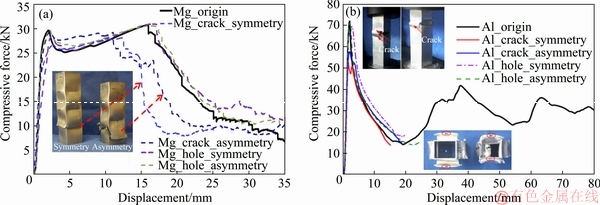 Fig. 11 Loading curves and failure modes of magnesium (a) and aluminum (b) tubes with induced features