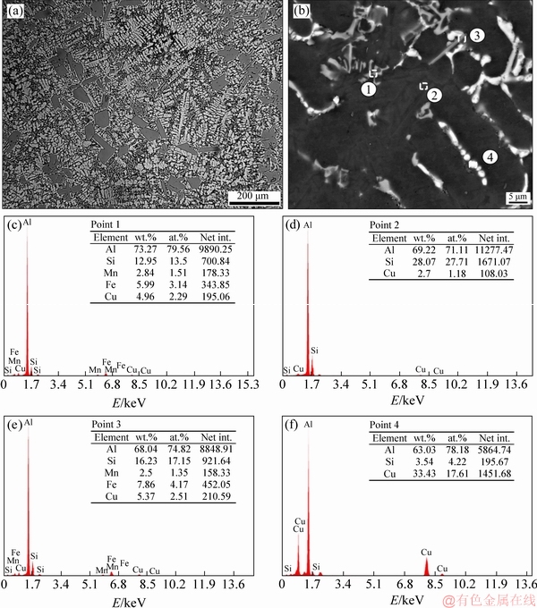 SEM observations and EDS analysis were performed in order to determine the chemical composition of intermetallic compounds (Figs. 1(b-f)). Regarding the peaks in EDS analysis and according to the results in Refs. [19,20], the three main intermetallic compounds include β-Al5FeSi (needle-shaped), Al15(FeMn)3Si2 (script-like), and Al2Cu (interconnected with each other and agglomerated severely). In fact, because of the low solubility of iron in aluminum, almost all the iron atoms form intermetallic compounds. IRIZALP and SAKLAKOGLU [20] have found that the brittle and needle-like morphology of β-Al5FeSi leads to a reduction of the tensile strength and elongation. HAGHSHENAS and JAMALI [3] expressed that the Fe-rich phases tend to have a relatively low bond strength due to their hard and brittle nature.