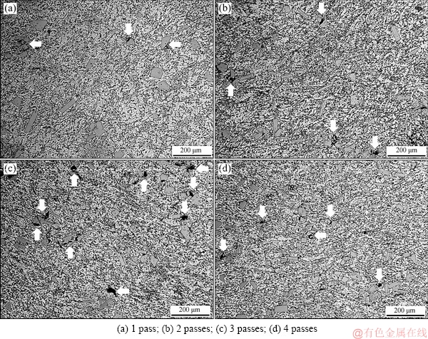 Figure 2 shows the OM images of the samples processed by ECAP. As shown in Fig. 2(a), the dendritic structure is decreased after the first ECAP pass. With increasing number of passes up to 4, no dendritic structure is found in the alloy. On the other hand, it is observed that ECAP process can break PSPs and form voids around them because of the brittle nature of the silicon crystals (white arrows). Other researchers [21,22] have verified the formation of voids around the PSPs after plastic deformation. Also, with increasing the number of passes, the pre-formed voids around the PSPs were eliminated or the size of voids deceased due to the flowing of Al matrix. But, after 4 passes, some voids remained, yet. According to Fig. 2, the average size of the PSPs is gradually decreased due to the breakage of PSPs with increasing the number of passes.