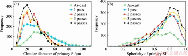 The size and sphericity distributions of the PSPs in different conditions are illustrated in Fig. 3. It is seen that the PSPs size in the as-cast sample (green line) is very scattered. It may be dependent on casting conditions and nature of PSPs in solidification moment. It is noteworthy that the fractions of PSPs larger than 50 μm in the as-cast, 1, 2, 3, and 4 passes processed samples are 30%, 18%, 6%, 5%, and 3%, respectively. On the other hand, the fractions of PSPs less than 30 μm in the as-cast, 1, 2, 3 and 4 passes processed samples are 28%, 50%, 62%, 66%, and 74%, respectively. Nevertheless, further increasing the number of passes up to 4 leads to the decrease in the average size of PSPs. The average sphericity of PSPs of the as-cast alloy is about 0.62 and the sphericity distribution is uneven due to irregular morphologies such as polygons, star-shaped and thick plates with sharp edges in the primary silicon. With increasing number of ECAP passes, the PSPs are broken (see Fig. 2). As a result of fragmentation of PSPs, as shown in Fig. 3(b), the sphericity value increases. It should be noted that increasing the sphericity of PSPs leads to decreasing the stress concentration at particle/matrix interfaces. JUNG et al [23] also reported that the spheroidization of Si reduces the stress concentration at the interface between silicon particles and the aluminum matrix.