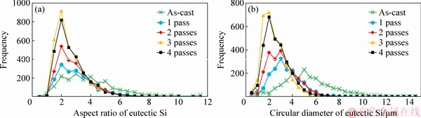 For fragmentation of silicon particles under the thermomechanical condition, there are two distinct mechanisms including mechanical fragmentation and thermal disintegration as reported by HAGHDADI et al [24]. As shown in Figs. 2 and 4, PSPs were mechanically fragmented and there was no sign of necking in the silicon particles. Actually, the stresses resulting from plastic deformation of the matrix (during ECAP process, the aluminum matrix undergoes a higher flow stress level) would cause particle fragmentation. These stresses may be results of the differences in elastic modulus and deformation behavior of silicon particles and aluminum matrix. Also, since the ECAP process was performed at high temperature and samples were held in ECAP die during deformation, the mismatch of thermal expansion coefficients between the silicon and aluminum leads to creating a high degree of local stresses between particles and matrix [25]. The effect of imposed ECAP passes on the aspect ratio and size of ESPs as well as the related features in the as-cast sample is presented in Fig. 5. It can be seen that the aspect ratio and size of ESPs are strongly affected by ECAP passes. The aspect ratio of ESPs is decreased with increasing the number of passes. The average aspect ratio of ESPs is decreased from 4.1 for the as-cast sample to 2.7 after the fourth pass. In addition, the fractions of ESPs larger than 5 μm in the as-cast, 1, 2, 3 and 4 passes processed samples are 46%, 9%, 5%, 1%, and 3%, respectively. In a similar way, the fractions of ESPs less than 2 μm in the as-cast, 1, 2, 3 and 4 passes processed samples are 8%, 17%, 29%, 51%, and 43%, respectively. It is clear that a large number of coarse eutectic silicon is fragmented in first two ECAP passes.