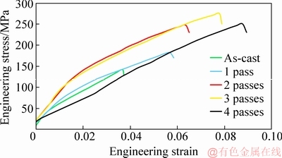 Engineering stress-engineering strain curves of the as-cast and the ECAP-processed samples are shown in Fig. 6.