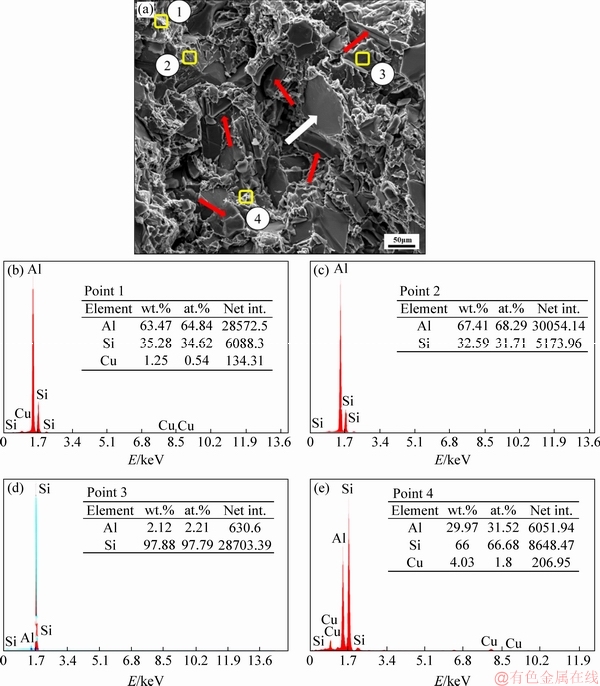 Figure 7 shows the fracture surface of the as-cast sample and corresponding EDS analysis. According to this figure, there are many PSPs on the fracture surface. The breakage of PSPs is observed in many places as indicated by red arrows. It can be said that, during the tensile test, the PSPs are fractured owing to their brittle nature. All PSPs exhibited a cleavage fracture as indicated by white arrows. The fractograph and the EDS analysis of fracture surface indicated that the cracks tend to pass through the PSPs and networks of eutectic compounds. It is clear that this is a brittle fracture. In brittle fracture, cracks may spread rapidly, with very small plastic deformation (see Fig. 6). IMMANUEL and PANIGRAHI [29] have reported that in the Al-Si alloy, porosity, particles/matrix interface, and sharp edges of particles are potential sites for crack initiation because these are the stress risers. It should be noted that the mode of fracture is extremely related to the mechanism of crack propagation [30].