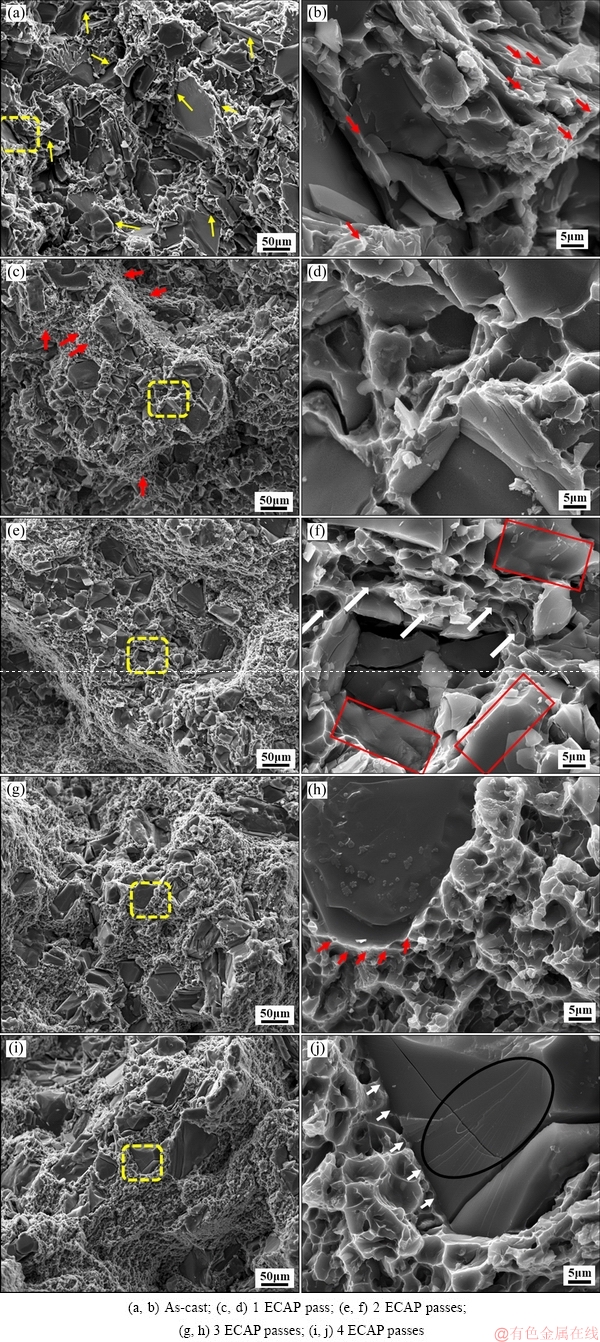 Figure 8 shows SEM fractographs for the fracture surfaces of as-cast and ECAP-processed samples. As seen in Fig. 8(a), some PSPs are separated from the aluminum matrix as indicated by yellow arrows. From Fig. 8(b), it is observed that the unmodified acicular ESPs may be the source of crack nucleation (see red arrows). Actually, the weak Si particle/Al matrix interfaces and the unmodified acicular ESPs raise the stress and thus crack nucleation.