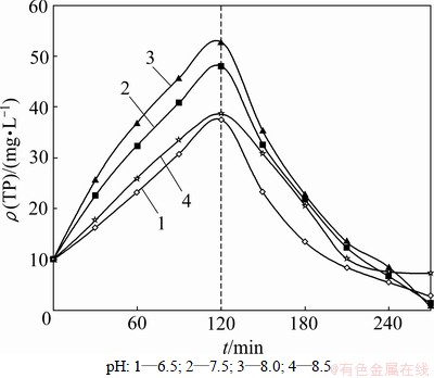 不同pH下TP质量浓度的变化如图3所示。从图3可见:当pH从6.5上升到8.0时,厌氧120 min内的释磷量由27.52 mg/L提高到42.69 mg/L,pH越高,释磷能力越强。这可以通过除磷生化代谢模型来解释:乙酸通过主动运输以分子的形式扩散进入细胞膜,在细胞内被转变为离子和质子形式。该过程需要消耗细菌质子移动力(PMF),其主要作用是通过膜结合酶复合体合成ATP并运输基质到细胞内;在聚磷菌体内,为了重建或者修复PMF,细胞需要分解体内储存的聚磷颗粒,并利用质子传输ATP的能力将分解的离子或分子输送到细胞外,从而发生了磷的释放,其宏观表现为液相中磷质量浓度的提高。因为pH的升高将减小质子移动力,为了维持PMF恒定,聚磷菌需要分解更多的聚磷颗粒,故升高pH能使更多的磷释放[17]。此外,Smolders等[18]认为,pH升高会增加聚磷菌运送乙酸进入细胞并转化为PHB的能耗,而这部分能量是通过聚磷菌水解体内的聚磷实现的,因此,可推知升高pH会增加吸收单位乙酸的释磷量。然而,当pH升高到8.5后,释磷量下降到28.69 mg/L。经分析认为:磷酸盐沉淀引起的液相中检测值变小,而且一部分沉淀吸附到菌胶团表面,阻碍了聚磷菌对碳源的吸收以及磷酸盐进一步释放[19]。
