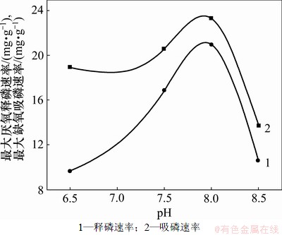 图4所示为不同pH下,最大比厌氧释磷速率和最大比缺氧吸磷速率变化情况。从图4可以看出:当pH为6.5~8.0时,最大比厌氧释磷速率、最大比缺氧吸磷速率与pH成正相关,随着pH提高而增大;最大比厌氧释磷速率由pH为6.5时的9.62 mg/(g·h)增大到pH为8时的20.95 mg/(g·h);当pH大于8.0时易形成磷沉淀,释磷速率开始下降;当pH为8.5时,最大比厌氧释磷速率为10.59 mg/(g·h);当pH为6.5,7.5,8.0和8.5时,最大比缺氧吸磷速率分别为18.92,20.55,23.29和13.73 mg/(g·h)。试验结果表明:吸磷速率对pH变化趋势不如释磷速率的变化趋势明显。