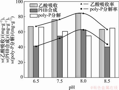 (2) 当pH在6.5~8.0 之间变化时,随着pH的升高,厌氧反应吸收的乙酸、合成的PHB、乙酸的吸收率和聚磷分解率都随之升高;当 pH为8.0时,厌氧末单位质量污泥吸收的乙酸、合成的PHB和聚磷质量分数分别为84.27,62.87和54.87 mg/g,乙酸的吸收率为50.56%,聚磷分解率为37.65%;当pH为8.5时,吸收的乙酸和合成的PHB质量分数分别下降到63.2 mg/g和40.33 mg/g,乙酸吸收率降为37.92%。