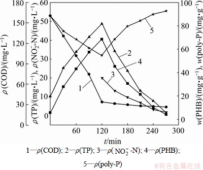 -N,PHB与poly-P质量浓度的变化如图6所示。从图6可知:厌氧段污泥中聚磷质量浓度呈下降趋势,厌氧段聚磷分解量为33.52 mg/g,PHB生成量为62.87 mg/g。这是由于厌氧时,聚磷菌分解体内的聚磷生成正磷酸盐,产生的能量用于吸收污水中挥发性脂肪酸,并以聚β羟基丁酸PHB的形式储存在体内。因此,在厌氧过程中,随着聚磷的分解,溶液中COD质量浓度逐渐降低,PHB和TP的质量浓度逐渐升高,厌氧末TP质量浓度达到48.98 mg/L。在缺氧阶段,聚磷逐渐积累,反应结束时聚磷浓度达到92.67 mg/g,PHB,