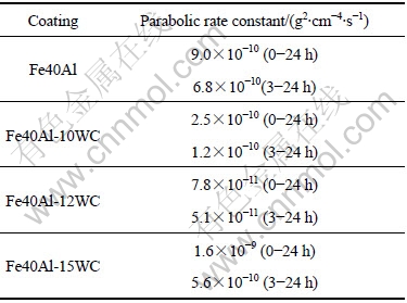 Table 2 Approximate parabolic rate constants for oxidation of Fe40Al-xWC (x=0, 10, 12, 15) coatings at 650 ℃