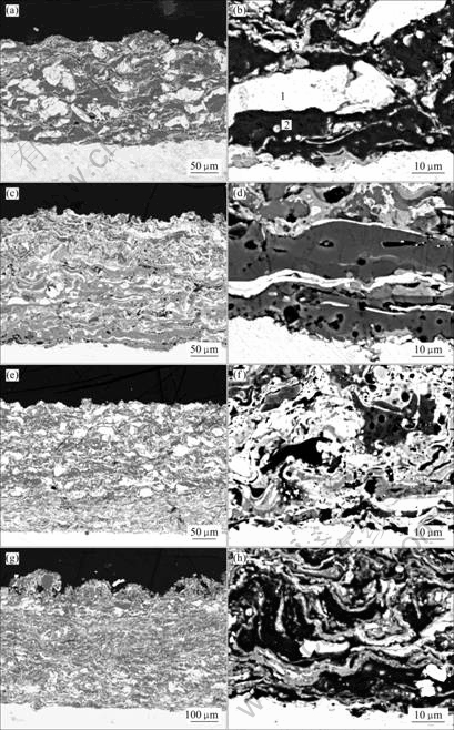 Fig.2 SEM/BEI micrographs showing cross-sectional morphology of as-deposited coatings: (a) Fe40Al at low magnification; (b) Fe40Al at high magnification; (c) Fe40Al-10WC at low magnification; (d) Fe40Al-10WC at high magnification; (e) Fe40Al-12WC at low magnification; (f) Fe40Al-12WC at high magnification; (g) Fe40Al-15WC at low magnification; (h) Fe40Al-15WC at high magnification