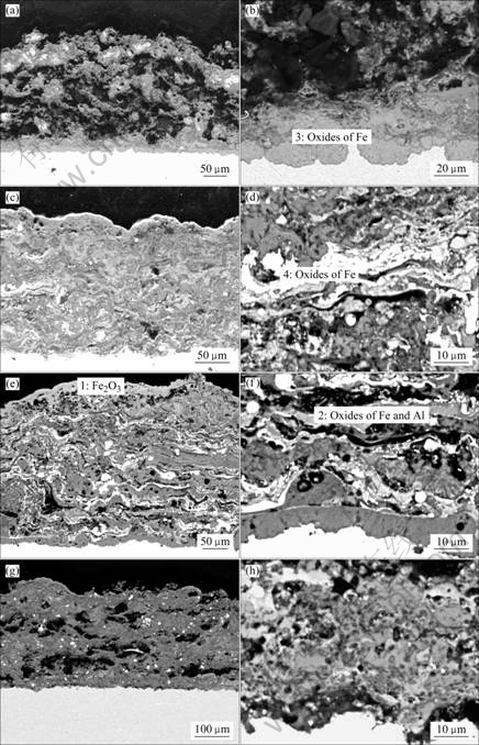 Fig.3 SEM/BEI micrographs showing cross-sectional morphology of as-deposited coatings oxidized in 0.1 MPa pure O2 at 650 ℃ for 24 h: (a) Fe40Al at low magnification; (b) Fe40Al at high magnification; (c) Fe40Al-10WC at low magnification; (d) Fe40Al-10WC at high magnification; (e) Fe40Al-12WC at low magnification; (f) Fe40Al-12WC at high magnification; (g) Fe40Al-15WC at low magnification; (h) Fe40Al-15WC at high magnification