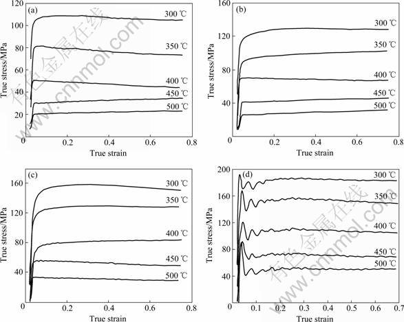 Fig.1 True stress—true strain curves of Al-Zn-Mg-Sc-Zr alloy at different stain rates: (a) 0.01 s-1; (b) 0.1 s-1; (c) 1 s-1; (d) 10 s-1