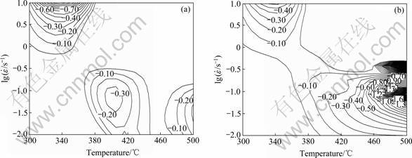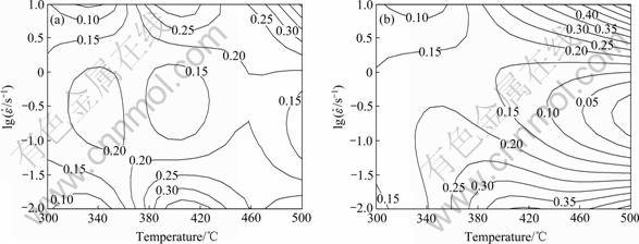 根据图1求出应变量为0.2和0.5(真应变大于0.5时加工图变化不大,故本研究只讨论真应变为0.2和0.5的加工图),不同变形温度不同变形条件下的真应力