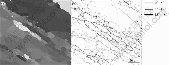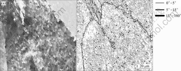 Fig.11 Grain orientation map and grain boundary map of alloy at 500 ℃, 10 s-1: (a) Grain orientation map; (b) Grain boundary map