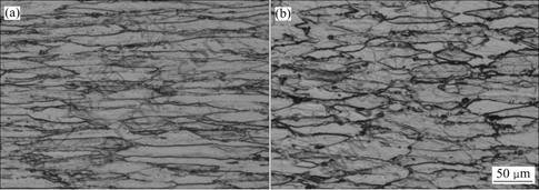 Fig.12 Optical microstructures at different conditions: (a) 450 ℃, 10 s-1; (b) 500 ℃, 0.01 s-1