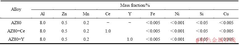 通过添加稀土元素来提高镁合金的性能是行之有效的方法[6-10]。已有不少关于利用稀土添加来提高传统Mg-Al系变形镁合金性能的文献报道,例如AZ31[11] 和AZ61[12-13],针对含Al较高的AZ80镁合金的稀土添加的相关文献则较少。对于AZ31和AZ61合金,由于Al含量较低,合金不具有热处理强化效果,因此,可以通过添加少量稀土的细化晶粒作用来改善合金的力学性能,但AZ80镁合金是商业变形Mg-Al合金中强度最高且唯一可以进行淬火时效强化的合金,由于稀土元素能够和Al生成高熔点的化合物,从而降低了固溶处理后α-Mg基体中的Al含量,因此,添加稀土后是否对AZ80合金的时效强化作用有影响并不清楚。本文作者以AZ80合金为研究对象,研究添加稀土Ce和Y元素对AZ80合金的熔炼过程、微观组织和力学性能的影响,并为稀土镁合金的进一步开发和应用提供实验基础。